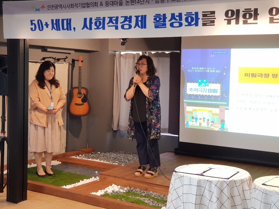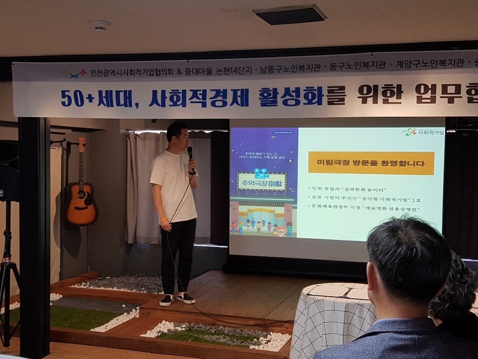 그 첫번째 섹션으로 진행하는 '사회적경제 여행'은 협의회와 노인복지관이 업무협약을 맺고 사회적경제를 체험하는 활동으로 미림극장 2층에서 사회적기업에 대한 소개와, 체험활동과 추억영화를 관람허는 순서로 진행됩니다.