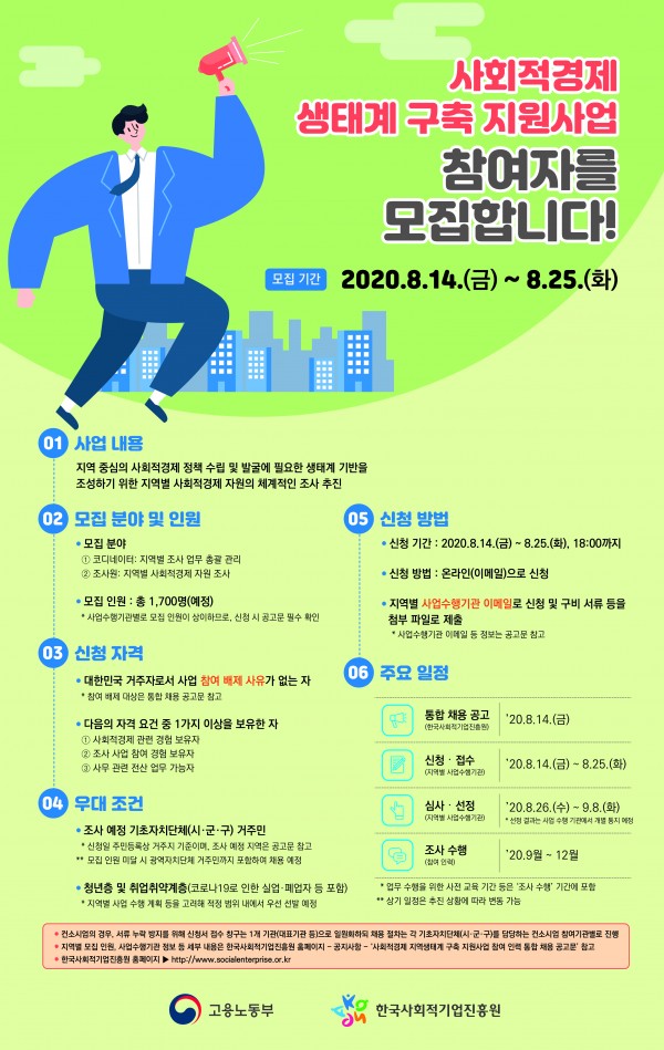 지역별 사회적경제 자원을 체계적으로 조사하여 지역 중심의 사회적경제 정책 수립 및 발굴에 필요한 생태계 기반 마련을 위하여 코디네이터 및 사회조사원을 모집합니다.