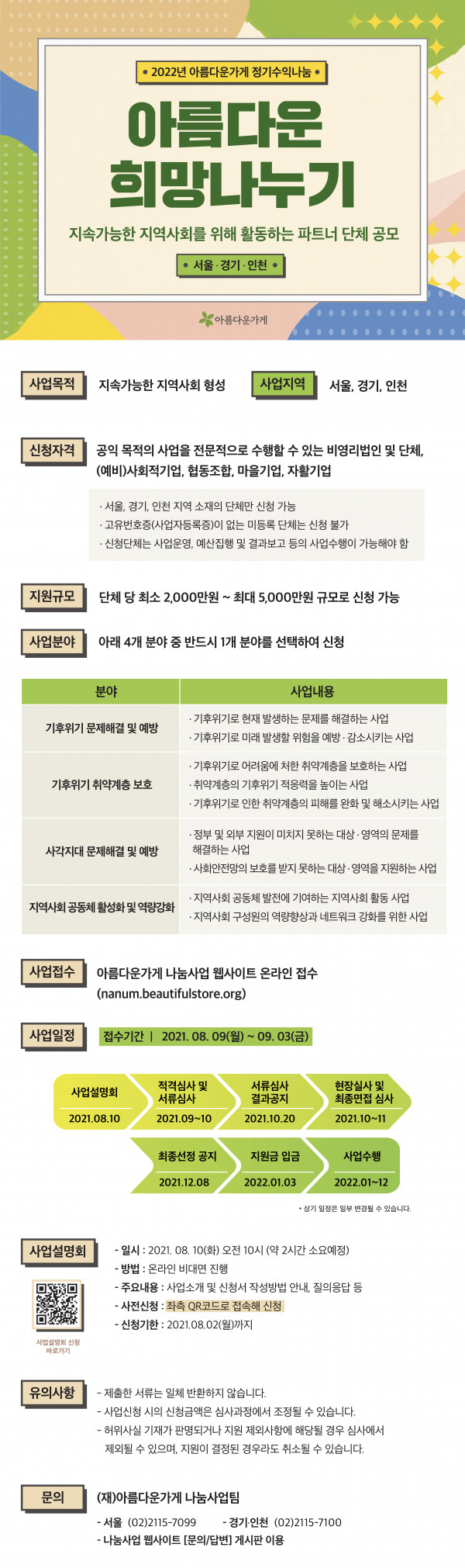 아름다운가게 2022 아름다운 희망나누기: 기후위기 대응 및 공동체강화 지원사업 파트너단체 모집(~9/3)