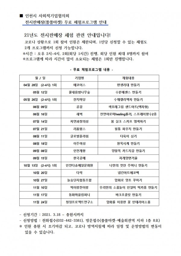 ■인천시사회적기업협의회 전시판매장.hwp (68.0K) 15회 다운로드 DATE : 2021-03-23 16:43:27