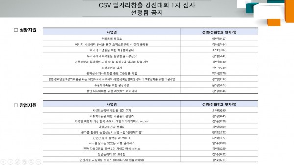 혁신적인 아이디어를 가지고 사회문제를 해결하는 ‘사회적경제기업과 청년창업’의 활동을 지원하기 위한 인천공항 CSV 일자리 창출 경진대회 1차 심사 결과를 다음과 같이 공고합니다.