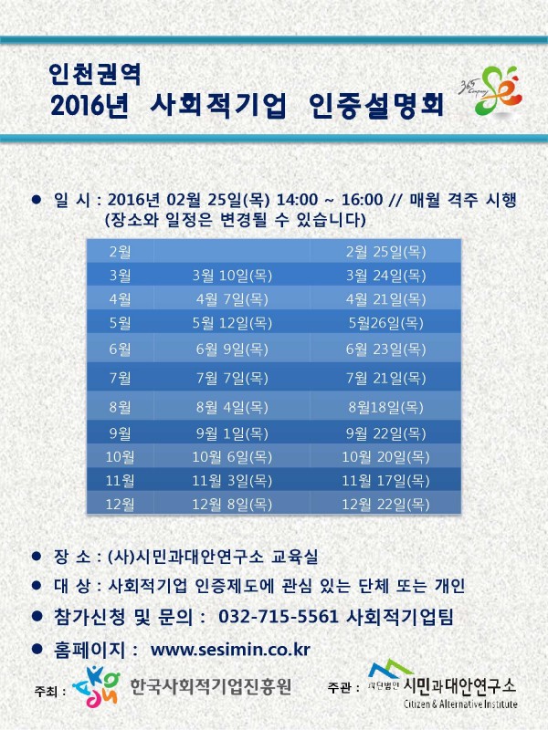 [통합지원기관]2016년사회적기업 인증 설명회 일정 페이지 정보 작성자 관리자 작성일16-02-12 18:00 조회5,564회 댓글0건 이전글 다음글 목록 본문 장소가 변경되었습니다.(기존)JST제물포스마트타운 13층 -> (변경)시민과대안연구소 교육실 댓글목록 등록된 댓글이 없습니다. 이전글 다음글 목록