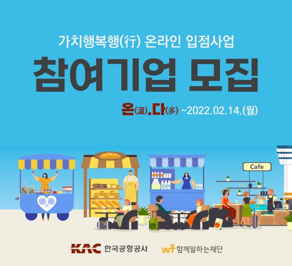 한국공항공사와 함께일하는재단은 전국 공항 인프라를 활용하여 지역 소공인과 사회적경제조 직 판로를 제공하고 제품 경쟁력을 강화시키는 성장사다리로서의 역할을 하기 위해 ‘가치행복행 특별전 및 샵인샵’을 추진하고 있습니다. 판로확대를 희망하는 양질의 상품을 보유한 사회적경제기업 및 소공인(가치행 복행(行) 사업 참여기업에 한함)의 추가 판로확대 및 성장지원을 위하여 온라인 스토 어(우체국쇼핑몰) 를 운영하여 판로를 넓히고자 합니다.