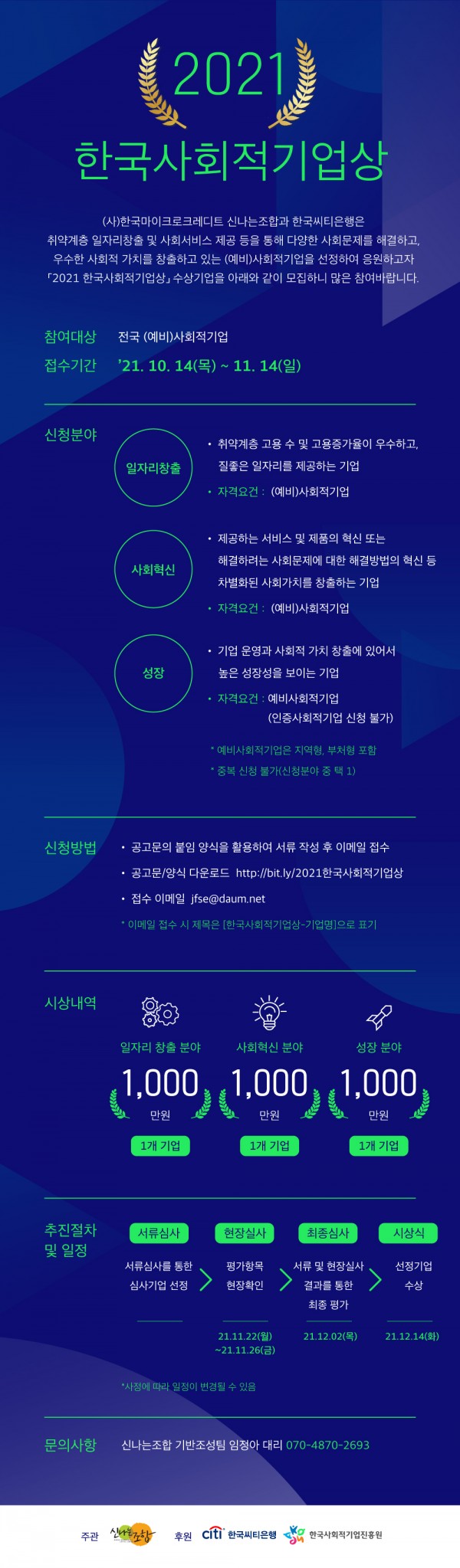 (사)신나는조합과 한국씨티은행은 취약계층 일자리창출 및 사회서비스 제공, 다양한 사회문제를 해결하기 위해 애써온 사회적기업을 격려하기 위해 「2021한국사회적기업상」 수상기업을 아래와 같이 모집하니 많은 참여바랍니다.
