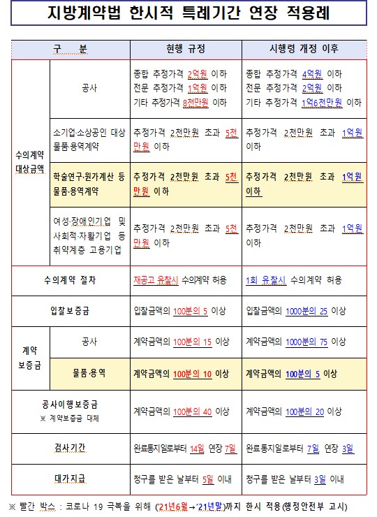 행정안전부 "지방계약법 시행령 수의계약 등에 한시적 특례기간도 (기존) '21.06.30.까지 -> (변경) '21.12.31.까지로 한시적 특례기간이 변경 되었음을 안내드립니다.
