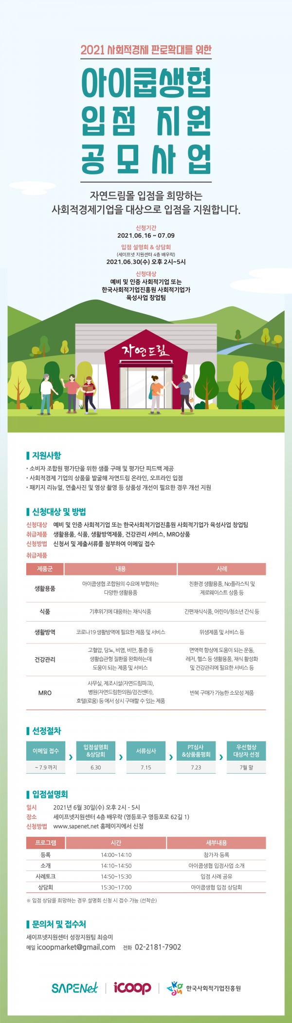 2021년 사회적경제 판로확대를 위한 아이쿱생협 입점지원 페이지 정보 작성자 관리자 작성일21-06-21 10:52 조회1,113회 댓글0건 관련링크 http://sapenet.net/?p=8018498 850회 연결 이전글 다음글 목록 본문 2021년 사회적경제 판로확대를 위한 아이쿱생협 입점지원☞ 입점신청서 및 입점설명회 사전신청하기 댓글목록 등록된 댓글이 없습니다. 이전글 다음글 목록