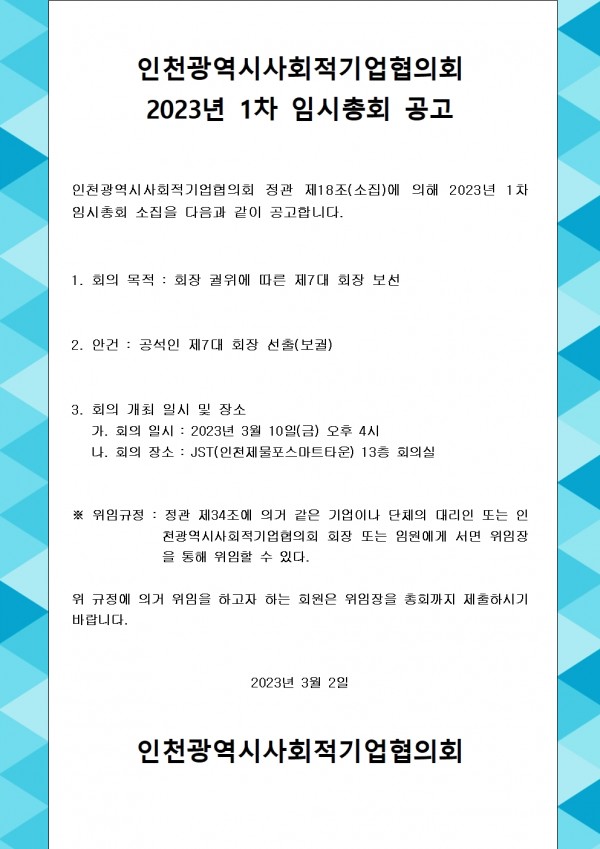 인천광역시 사회적기업협의회 정관 제18조(소집)에 의해 2023년 1차 임시총회 소집을 다음과 같이 공고합니다.